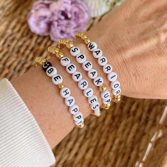 Fearless 6mm Personalized Gold Beaded Bracelet with White Letter Beads